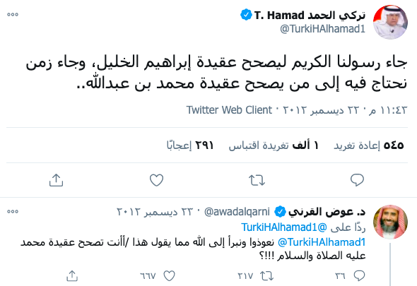 وكتب تركي الحمد عبر موقع التواصل الاجتماعي تويتر: وكان أبوه يعمل في شركة أرامكو البترولية. تعاون روسي تركي لإنشاء مطار فضائي تركي. يريدون لأرض الحرمين أن تصبح دبي ثانية، يريدون أن ينتشر فيها الزنا وشرب الخمر وغير ذلك من المعاصي. وانتقد النائب الكويتي السابق، وليد الطبطبائي، تغريدة الحمد، ورد عليها عبر تويتر بالقول إن الأحاديث النبوية، وصحيح البخاري خصوصا، مروية.